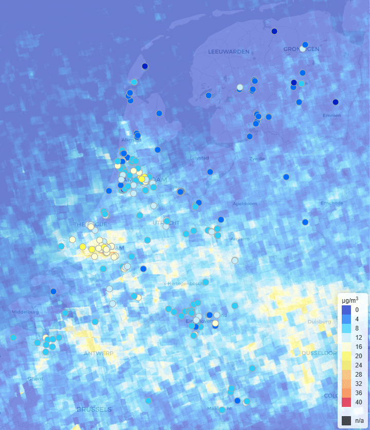 Op het kaartje zie je de gemiddelde NO2-concentratie herleid uit TROPOMI metingen. De stipjes zijn de concentraties gemeten door de leerlingen met de Palmesbuisjes.